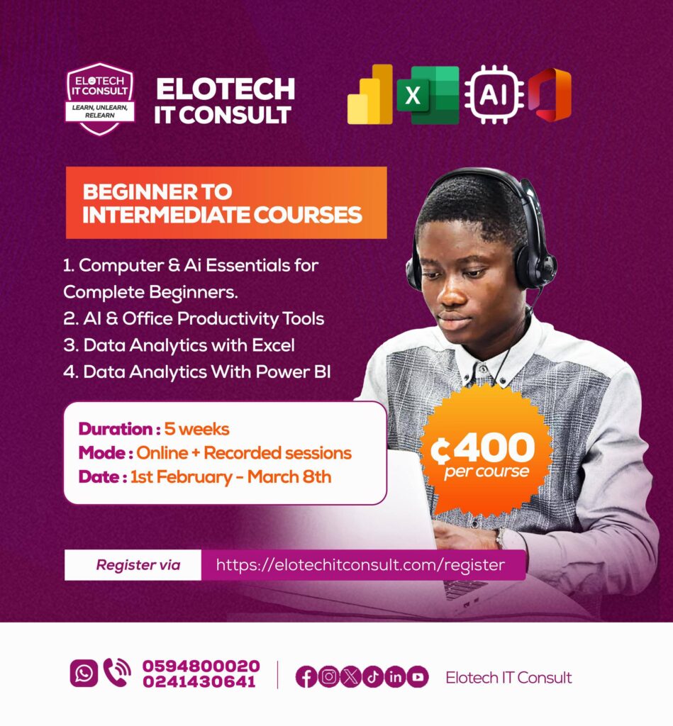 The PRE-TERTIARY COMPUTER CLASSES course introduces students in JHS, SHS and graduates to essential computer literacy skills such as AI Tools, Productivity Tools (Word, Excel, PowerPoint, Google Forms). Above course will be taught through engaging lessons and hands-on activities to lay the foundation for future tech skills.